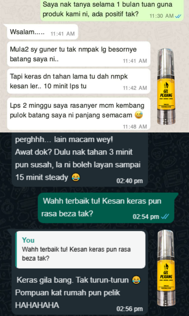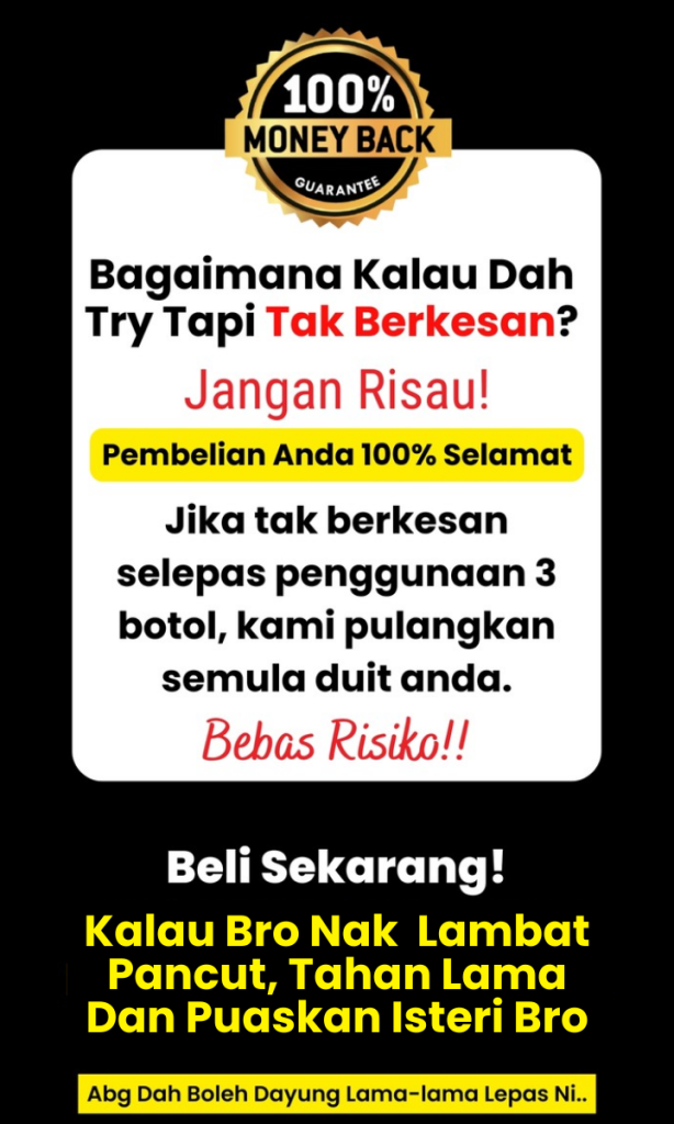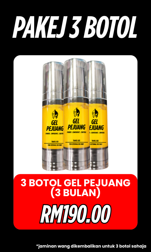 Jaminan wang akan dikembalikan 100%. Anda perlu mengambil pakej 3 Botol Gel Pejuang untuk dapatkan jaminan ini.